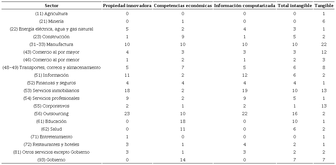Al contrastar la distribución en PI, CE e IC contra la del total de intangibles de la Tabla 5 se destaca lo siguientes: 1) Outsourcing tiene una mayor concentración en PI (23%) e IC (21.6%) y menor CE (10.1%); 2) Información y medios masivos tiene una baja participación en CE (1.7%), pero elevada en PI (10.7%) e IC (12.4%); Servicios inmobiliarios tiene una pequeña concentración en CE (1.7%), pero elevada en PI (18.5%) e IC (18.6%). Los demás sectores tienen un comportamiento parecido.