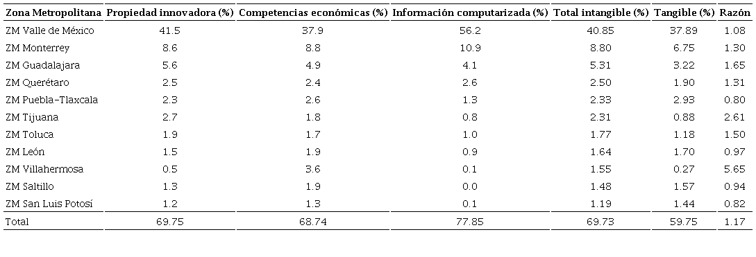 La Tabla 6 presenta un resumen de la distribución de los flujos de inversión tangible e intangible en 2018 entre las primeras 11 zonas metropolitanas con mayor concentración y se incluye la distribución de los flujos intangibles para cada una de las categorías CHS. Estas zonas metropolitanas concentran 70 y 60% de inversión intangible y tangible de todo el país, teniendo la Zona Metropolitana del Valle de México (ZMVM) 41 y 38% de ellos. El segundo y tercer lugar de concentración de inversión intangible corresponden a las zonas metropolitanas de Monterrey y Guadalajara con 9 y 5%, respectivamente. La cuarta y quinta posición corresponden a las zonas metropolitanas de Querétaro y Puebla-Tlaxcala con 2.5 y 2.3%, respectivamente. La última columna de la tabla muestra la razón inversión intangible /inversión tangible como un indicador de intensidad de intangibles. Las zonas metropolitanas más grandes del país tienen una razón mayor que 1 mostrando con ello mayor intangibilización; no obstante, la ZMVM es la que tiene el menor valor. Las zonas metropolitanas que despliegan mayor presencia de intangibles son Villahermosa (5.7) y Tijuana (2.6). Las zonas metropolitanas de Puebla, León, Saltillo y San Luis Potosí son las más tangibilizadas, lo que va en sintonía con su fuerte vocación industrial.