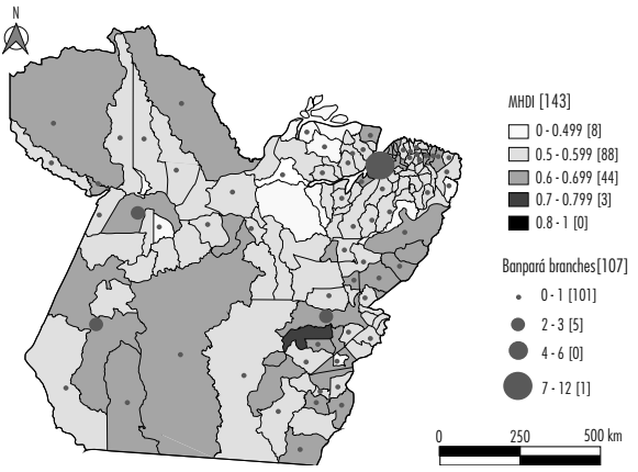 The municipalities of the State of Pará have a significant heterogeneity concerning the respective stages of their socioeconomic development. It is possible to observe that some regions, such as the metropolitan area, have more substantial growth potential and react differently to incentives. Private banks, in general, tend to concentrate in these regions. However, this paper demonstrates that Banpará is significantly present in municipalities with less development, emphasizing the development policy implemented to expand the bank.