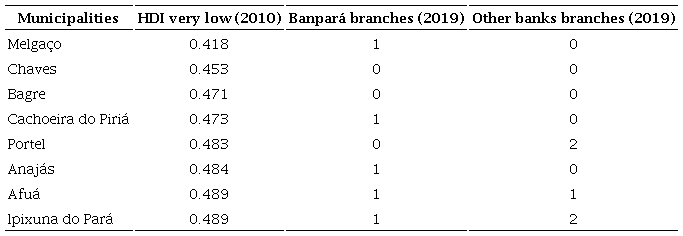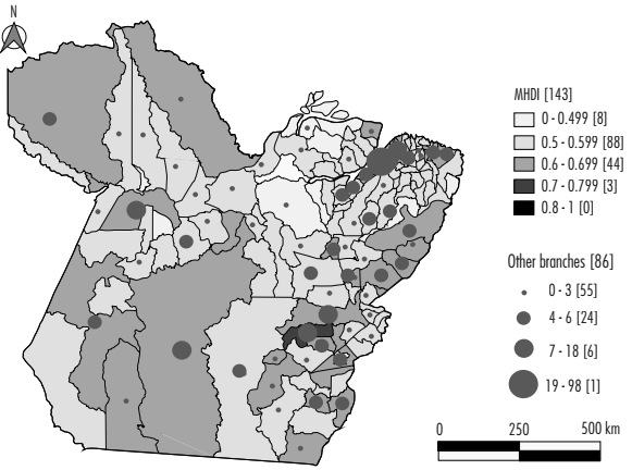 In Pará, most state municipalities, corresponding to 61%, have low MHDI (0.5-0.599), and 30% have medium MHDI (0.6-0.699). Only three municipalities, representing 2.1%, have high MHDI (0.70.799): Belém, Ananindeua, and Parauapebas. Eight municipalities, 5.6%, still have a very low MHDI (0-0.499), which are Melgaço, Chaves, Bagre, Cachoeira do Piriá, Portel, Anajás, Afuá, and Ipixuna do Pará. It should be noted that Melgaço (PA) is also the municipality with the lowest MHDI in Brazil. Among the lowest MHDI municipalities, only Portel, Bagre, and Chaves do not have Banpará branches. The other municipalities have at least one Banpará branch, and only Portel has a private institution (see Table 1). Therefore, more branches are located in the most deprived municipalities.