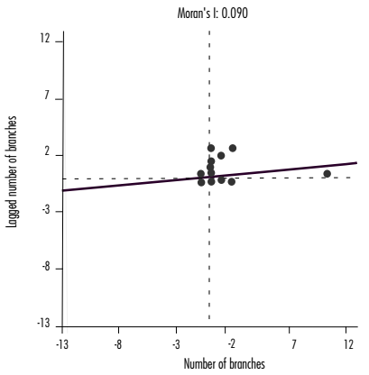 The result indicates that Moran’s I= 0.090 is positive, revealing spatial autocorrelation. The result means that municipalities with a higher number of Banpará branches are neighbors of municipalities with a large number of branches. This correlation, however, is not high, as shown in the gradient of the straight line in Figure 3.