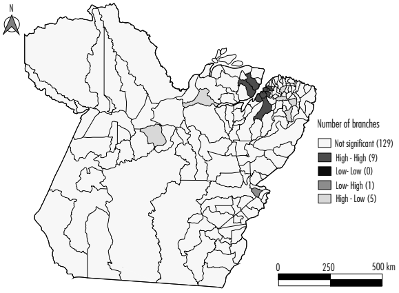 In Figure 4, we can see a pattern of high-high autocorrelation in the municipalities in dark gray, especially in the metropolitan region of Belém. This indicates that the region has formed a cluster representing a high concentration of Banpará branches. Additionally, municipalities indicated as high-low and low-high indicate a higher concentration of branches in these municipalities.