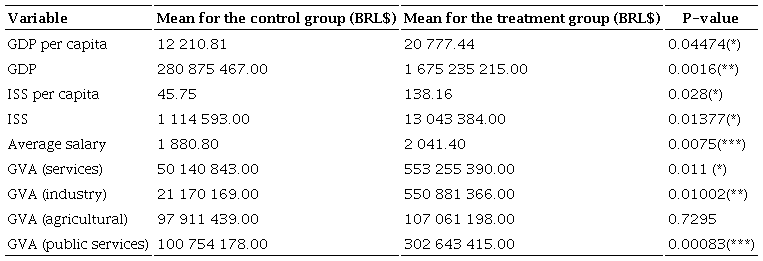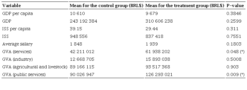 Artificial comparison groups were created using the propensity score matching method based on GDP per capita and Employment (civil construction). The 2010 GDP per capita grouped the municipalities through productivity parameters, the consumer market. Employment constitutes a parameter for verifying the economic dynamism of municipalities in terms of labor relations and local infrastructure development.