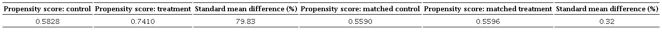 In this way, estimating the average treatment effect after matching according to the selected technique is possible. It is also possible to use the statistics with weights, which are then given by the inverse of the probability estimated in the propensity score if the municipality belongs to a treatment group and by the complement of such a probability if the municipality belongs to the control.