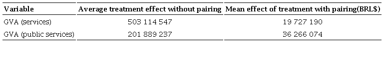 In comparison, Table 8 shows an estimation in BRL$ 474 098 629.00 for the average effect of the presence of GVA (services) in the sample without pairing, with a value-p relevant at 1%. As for the paired sample, the ATE was estimated in BRL$ 127 770 276.00 for GVA (services), with a significance of the p-value at 5%. As for GVA (public services), the non-paired ATE was estimated in BRL$ 189 210 502.00, with significance at 0.1%, while for the paired sample, the value of ATE was estimated in BRL$34.067.367,00, significant at 1%.