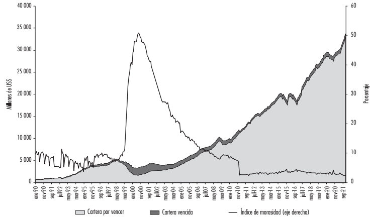 Se puede observar en la Figura 1 la evolución de algunos indicadores de la capacidad de solvencia y liquidez de la banca ecuatoriana. Es evidente como la cartera a vencer y vencida subieron dramáticamente desde el periodo de las reformas a principios de los noventa, llegando a sumar más de US$5.5 mil millones en 1997 y 1998. Sin embargo, ambos valores decrecieron momentáneamente luego de 1999 y se mantuvieron en niveles más bajos en los primeros años de la dolarización oficial. Vale mencionar que, en términos históricos más recientes, estos indicadores se dispararon fuertemente desde la segunda mitad de la década de 2010 y han continuado con esta tendencia llegando a superar los US$33 600 millones para 2021. Con respecto al índice de morosidad -que es una de las formas de mesurar el riesgo de un grupo de activos bancarios y es calculado a partir del tamaño relativo de la cartera de crédito vencida como proporción de la cartera total-, alcanzó un alarmante 51% en agosto del 2000, lo que significa que para cada 100 sucres dados como préstamos al público, nada más 49 eran de operaciones que los clientes habían cumplido con el pago de amortizaciones e intereses puntualmente a lo que correspondía a sus contratos. Si, por un lado, hubo un incremento masivo en la cartera vencida desde la crisis bancaria previa a la dolarización hasta 2021, por otro lado, el índice de morosidad ha disminuido desde el 2000 estabilizándose en niveles mucho más bajos entre 2011 y 2021.