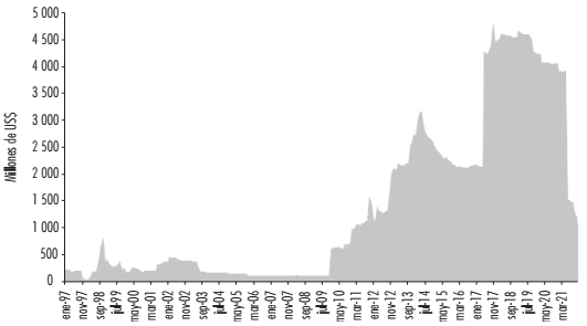 Era tal la “adicción” de los bancos por recursos provenientes del Estado que, para “el año 1999, buena parte del sistema financiero ecuatoriano enfrentaba problemas de solvencia, por lo que su supervivencia dependía exclusivamente de sus niveles de liquidez y por ello recurrieron cada vez en mayor número y magnitud a las facilidades de liquidez del Instituto Emisor (el BCE)” (BCE, 2010, p. 39). A partir de 2009, posterior a la crisis financiera originada en Estados Unidos y siguiendo la tendencia de los bancos centrales globales de impulsar medidas anticíclicas con masivos programas de compras de títulos, la cifra de créditos emitidos por el BCE, con el sistema financiero como destino se disparó, estabilizándose en US$1 045 millones al cierre de 2021.