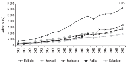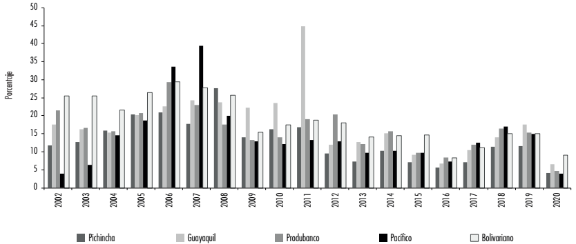 De acuerdo con Flores et al. (2017), los grandes bancos con mayor poder de influencia política lograron sobreponerse a las adversidades ocasionales debido a que estos siempre se han “anticipado” a momentos adversos e impulsado medidas para “blindarse”, como estar constantemente comprando dólares, con lo que lograron reducir los costos financieros y así lucrar con la propia dolarización. La facilidad en acceder a esos canales es desigualmente distribuida entre los propios bancos del sistema, lo que impulsó una tendencia a la concentración de las actividades bancarias en un reducido grupo de instituciones líderes, a saber: Banco Pichincha, Banco del Pacífico, Banco Guayaquil, Banco de la Producción (Produbanco) y Banco Bolivariano. Sin embargo, y pese la preponderancia de la gran banca de capital nacional en el ranking de mayores instituciones, fue notoria la presencia de bancos extranjeros o corresponsales financieros.13