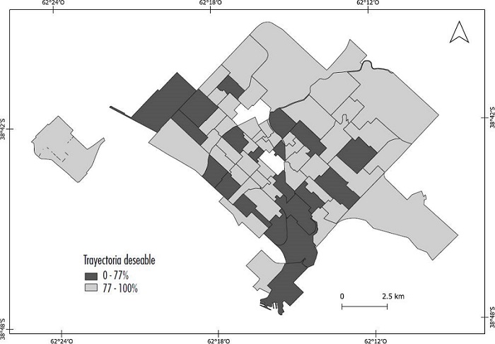 En principio, y a partir de la caracterización de los conglomerados identificados, es más probable que logren una trayectoria deseable quienes pertenecen al grupo de barrios con “condiciones favorables” para la escolarización, que quienes residen en barrios del cluster con “condiciones desfavorables” (véase Tabla 6).