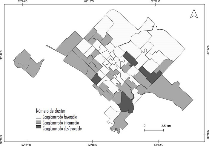 Una primera apreciación de interés es que la localización de los clusters de barrios en el espacio urbano es coherente con la evidencia de segregación residencial en la ciudad de Bahía Blanca. La Figura 2 muestra que los barrios pertenecientes al conglomerado con condiciones favorables se ubican principalmente en el centro y norte de la ciudad; mientras que el grupo con condiciones intermedias se corresponde con la periferia-pobre; y el conglomerado con condiciones desfavorables incluye a algunos asentamientos con población muy vulnerable. Asimismo, si bien no es estricta la correspondencia entre las Figuras 1 y 2, sí resulta claro que la distribución desigual de las condiciones de educabilidad de la población en el territorio se encuentra vinculada a la distribución desigual de sus resultados educativos.