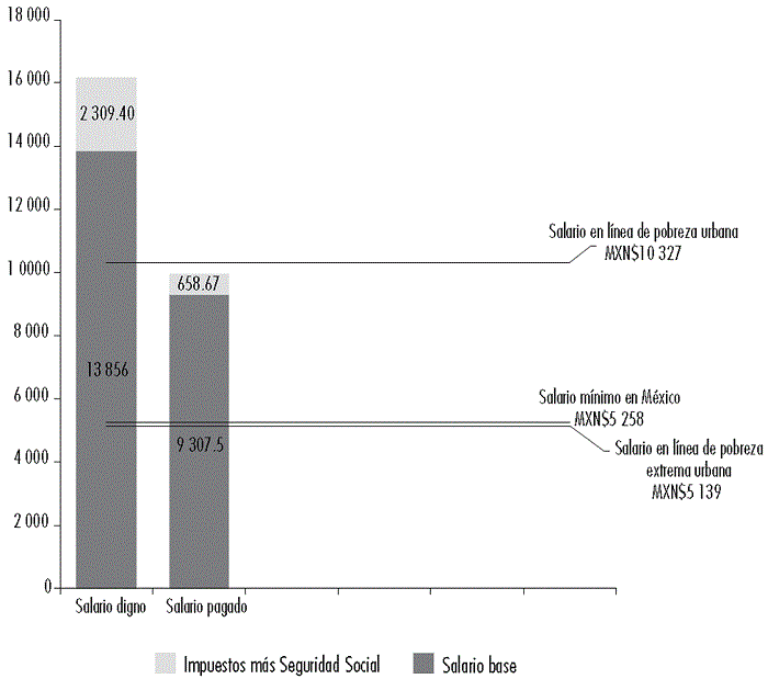 Por otro lado, la discrepancia entre el salario en línea de pobreza extrema urbana (MXN$5 139.35) y el salario en línea de pobreza urbana (MXN$10 327.32) con respecto al salario digno estimado (MXN$16 165) en este ejercicio es del 214% y del 56%, respectivamente. Estas diferencias pueden asociarse al hecho de que, en el ejercicio realizado en este artículo, es evidente que el contenido nutricional del modelo de dieta considerado por el CONEVAL se encuentra por debajo de los macronutrientes necesarios para la actividad física de las personas trabajadoras en la BMW, según lo establecido por la NOM-037-SSA-2012 (Diario Oficial de la Federación (2012, 13 de julio)).