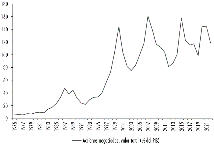 Las acciones se han convertido en una vía de financiamiento interno de las empresas no-financieras con el objetivo de emplear los fondos recaudados para aprovecharlo en operaciones -productivas, comerciales o financieras, etcétera- de las empresas de acuerdo a sus obligaciones. El Banco Mundial estima que el porcentaje de acciones negociadas en el mundo desde 1975 representaba el 6.1% del PIB mundial, mientras que en 2022 el valor total se incrementó a 119.2% del PIB mundial. Aunque el comportamiento del valor total de las acciones negociadas oscila con el tiempo, se observa un aumento del valor respecto a 1975, una dilatación de esta vía de financiamiento de las empresas y una dispersión de los tenedores de títulos por todo el mundo involucrados en las actividades empresariales (véase Figura 1).