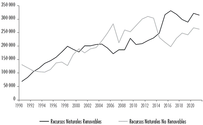En términos agregados, la participación de estas empresas como actores operadores de las actividades de extracción de recursos naturales con orientación exportadora puede observarse en el volumen de exportación de recursos naturales. Desde la década de los noventa del siglo pasado, la composición de las exportaciones en recursos naturales no renovables y renovables se ha incrementado sustancialmente, de USD$129 773.67 millones en 1990 a USD$262 308.40 en 2021 y de USD$67 760.91 millones en 1990 a USD$315 259 en 2021, respectivamente (véase Figura 2).