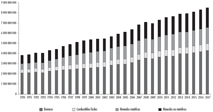 Dicho indicador ecológico -obtenidos de la suma de la extracción doméstica y las importaciones menos las exportaciones de materiales- muestra la cantidad de toneladas utilizadas en el consumo y producción interna, es decir, la cantidad de toneladas de materiales utilizadas directamente en el sistema económico. Del total de consumo doméstico registrado entre 1990 y 2017, la biomasa generada por actividades agrícolas representó 51.9%; los materiales generados por actividades de extracción de combustibles fósiles 8.4% y 17.5% materiales por extracción de minerales metálicos y minerales no metálicos 22.2%.