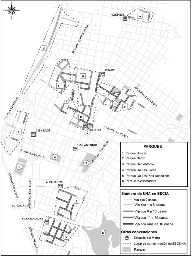 Esta investigación permitió identificar que en casi una quinta parte de los tramos visitados en las comunas 4 y 10 de la ciudad se reporta la presencia de la problemática y que los tramos donde ocurre el problema, se concentran en 11 lugares, 6 de ellos convergentes en la zona más céntrica. Sin embargo, puede darse movilidad de los nna entre estos sectores identificados, esto relacionado con características y dinámicas específicas de cada sector. La mayoría de estos lugares ya habían sido descritos por Morales en el 2002 como sectores de incidencia de escnna [18].