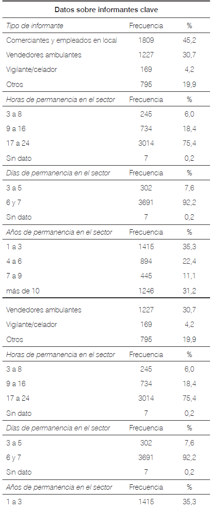 En total, se visitaron 634 tramos (entre ellos lugares públicos) y se diligenciaron 4000 encuestas, para un promedio de 6,3 personas encuestadas por tramo. De las personas encuestadas, el mayor porcentaje (45,2%) eran comerciantes o empleados ubicados en un local comercial del tramo. Más de tres cuartas partes de los informantes (76%) permanecen en el sector entre 9 y 16 horas. El 92% se encuentran en el sector entre 6 y 7 días a la semana. Más de la mitad (56,4%), lleva más de 5 años en el sector (tabla 1).