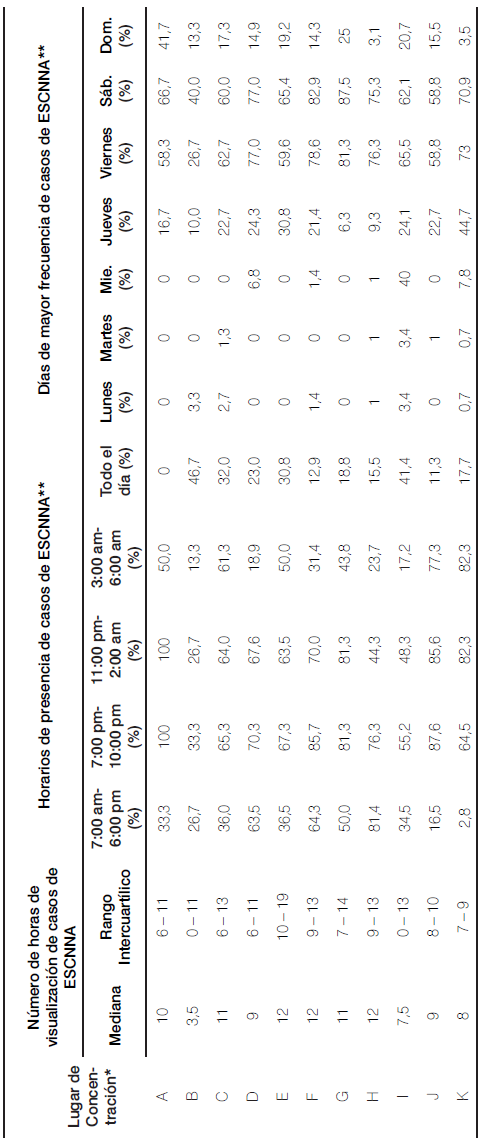En los lugares de concentración, los encuestados reportaron la ocurrencia de la escnna todos los días de la semana. Cuando se indagó por los días de mayor frecuencia de exposición de nna, las respuestas se concentran en los días viernes y sábado. En la mayoría de los lugares de concentración, la mediana del reporte de horas al día que se presenta el fenómeno oscila entre 7,5 y 12 horas. El horario más frecuente de presencia de casos de escnna correspondió a los horarios nocturnos (7:00 pm a 12:00 pm), no obstante, se aprecian sectores donde predomina la exposición de nna en horario diurno (7:00 am a 7:00 pm) y, en otros, en horas de madrugada (entre 3:00 am y 6:00 am) (Tabla 2).