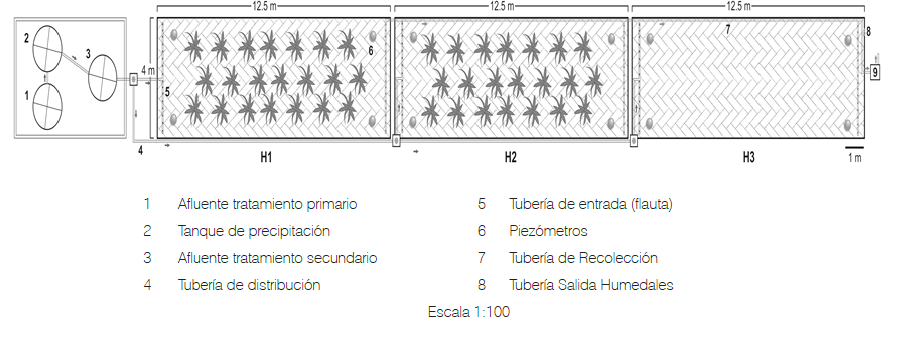 Adicionalmente un tratamiento secundario con tres humedales de flujo subsuperficial, Humedal 1 (H1), Humedal 2 (H2) y Humedal 3 (H3). Cada uno de 12,5 m de largo, 4 m de ancho y 0,45 m de profundidad, con afluente independiente y un caudal de 500 ml/ min. Impermeabilizados con geomembrana y doble protección de geotextil. El tiempo de retención hidráulico (TRH) de diseño para cada módulo fue de 3,5 días. Para la experimentación los humedales 1 y 2, se plantaron con Typha domingensis (dos planta por m2) y El humedal H3 se dejó como blanco, por lo tanto sin vegetación.