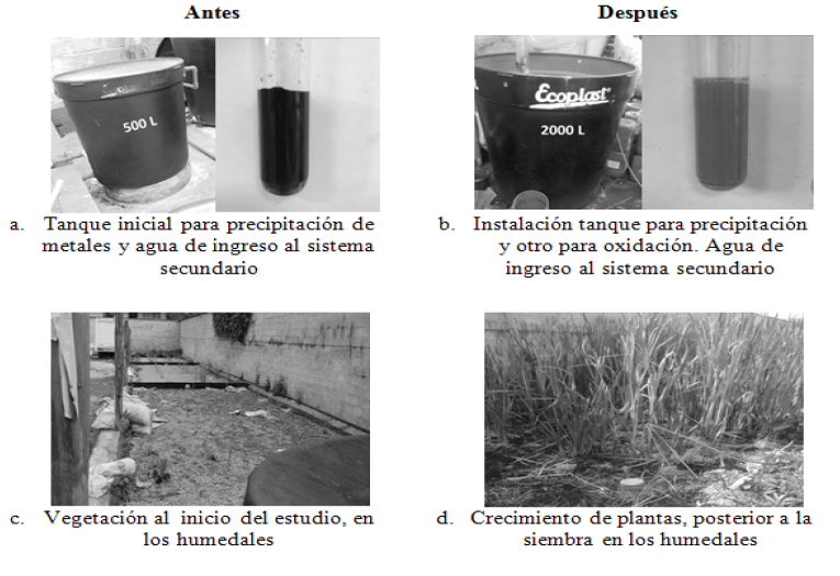 Antes de realizar las actividades de acondicionamiento físico en el sistema de tratamiento, la precipitación de los metales se realizaba en un tanque de 500 L con hidróxido de sodio y el sobrenadante ingresaba al sistema secundario, sin embargo por la turbulencia que se generaba, los metales se resuspendían e ingresaban a los humedales algunas trazas de los mismos. Por lo anterior, se instaló un tanque de 2000 L, solo para realizar la precipitación de los metales, el sobrenadante ingresa por bombeo a un segundo tanque de 2000 L, el cual tenía la función de almacenar el agua de ingreso a los humedales. En este segundo tanque se implementó la aplicación de sulfato ferroso y peróxido de hidrógeno en una relación de 1:3, con la finalidad de disminuir la carga orgánica que ingresaba a los humedales. En la tabla 3 y figura 2 se presenta una síntesis de las condiciones del sistema de tratamiento antes y después de las actividades de acondicionamiento.