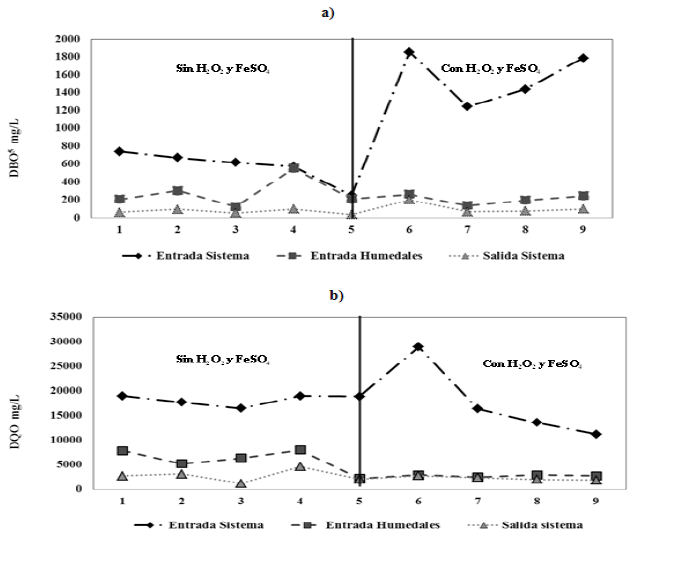 Similar situación se presentó con la dbo5, para la cual la mediana de la concentración del afluente del sistema de humedales pasó de 253,5 mg/L a 209 mg/L, al aplicar el peróxido de hidrógeno y el sulfato ferroso. En el efluente del sistema de humedales se logró una disminución en la mediana de la concentración de 77,4 mg/L a 74 mg/L. Cuando se analiza el comportamiento del sistema secundario con humedales se puede apreciar que en ellos se alcanzó una remoción de 64,6% (135 mg/L) para la dbo5 y de 17,8% (529,8 mg/) para la dqo.