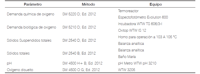 En el sitio, se midieron pH y oxígeno disuelto. En el laboratorio se analizó DQO, DBO5, ST y SST, bajo los procedimientos establecidos en los métodos estándar para el análisis de aguas y aguas residuales [11] (Tabla 1).