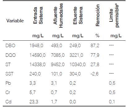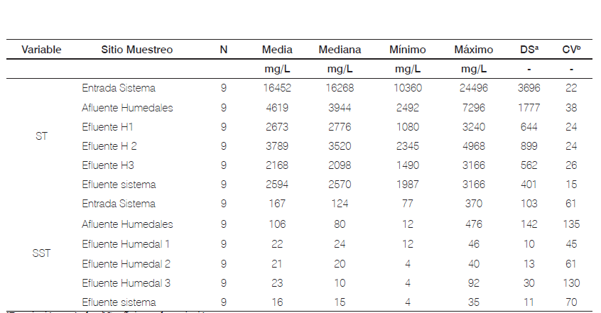 Al igual que la dqo, los sólidos totales que ingresaron al sistema de tratamiento fueron altos. En el tratamiento primario se logró una disminución de 12324 mg/L de ST, y en los humedales se removieron 1374 mg/L de ST. En cuanto a los sólidos suspendidos totales en el tratamiento primario se alcanzó la disminución de 80 mg/L y en los humedales se remueven 65 mg/L (Tabla 4).