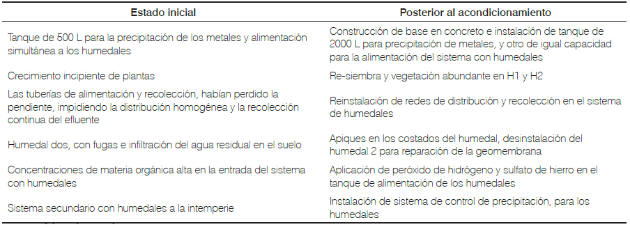 Las actividades realizadas para el acondicionamiento del sistema de tratamiento tuvieron una duración de seis meses, en los cuales se realizaron mejoras en la infraestructura física del sistema de tratamiento primario, en las redes hidráulicas de distribución y recolección del sistema de tratamiento secundario, montaje de sistema de control de precipitación, el cual consistió en la instalación de un techo tipo invernadero, y resiembra de plantas. Lo anterior en pro de mejorar el funcionamiento del sistema de tratamiento y de este modo aprovechar la infraestructura existente para cumplir con las eficiencias requeridas por la normatividad vigente.