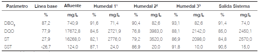 Los tres humedales tuvieron comportamientos diferentes, aunque contaban con las mismas dimensiones, material granular y caudal. Lo cual se evidencia mediante el análisis estadístico. El H2 presentó las menores remociones con relación a los otros dos humedales. El H3, sin plantas, alcanzó mayor remoción de los parámetros de estudio (Tabla 5).
