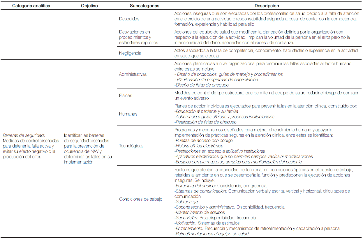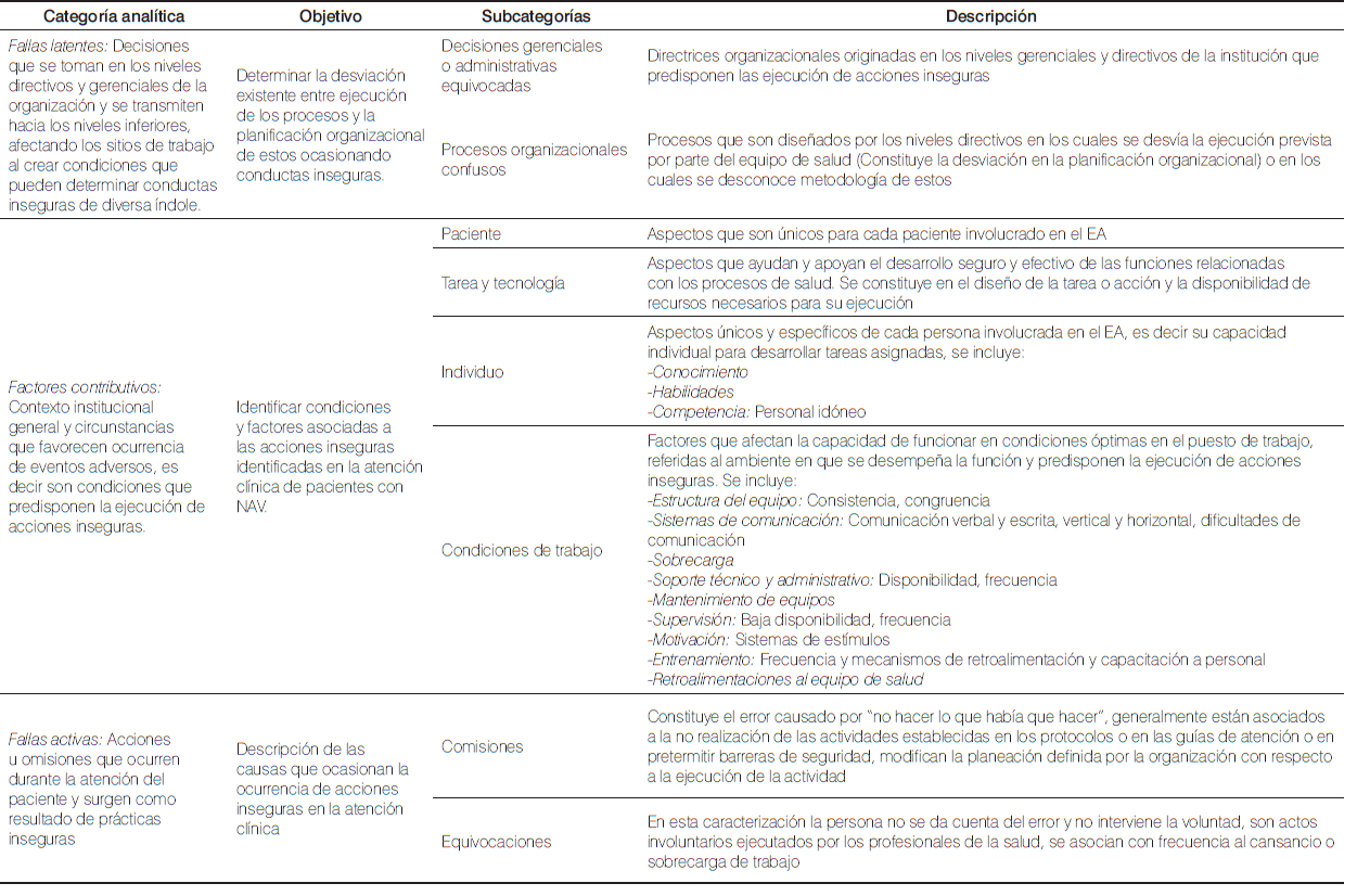 Como se estableció anteriormente, el conjunto de categorías analíticas se extrajo del Modelo Organizacional de Causalidad de Errores y EA (Tabla 1); los fundamentos de este modelo y sus aplicaciones se desarrollaron a partir de la investigación de accidentes en la industria aeronáutica, petrolera y nuclear. En salud su propósito es facilitar la investigación de los incidentes clínicos, lo cual implica ir más allá de identificar la falla o los culpables a través del análisis de 4 dimensiones que se usaron como categorías de análisis en este estudio: fallas latentes, factores contributivos, fallas activas y barreras de seguridad [17].