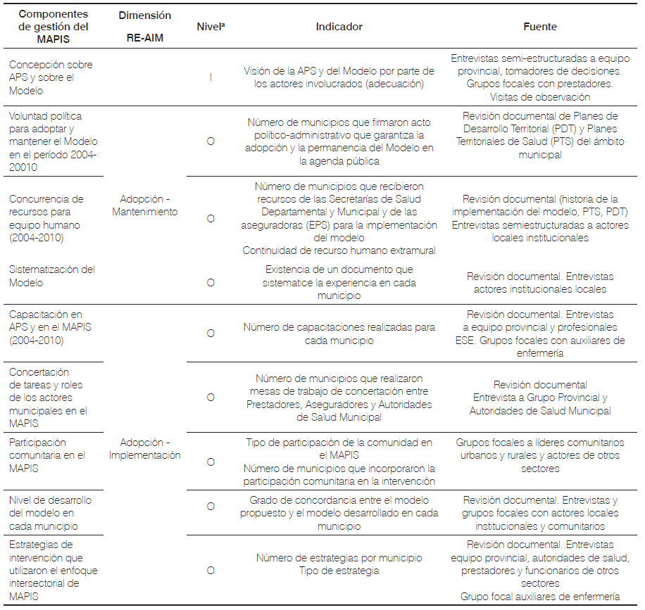 Componentes de gestión del MAPIS, dimensiones e indicadores de evaluación del marco RE-AIM abordados en la evaluación del MAPIS, Santander, Colombia, 2010