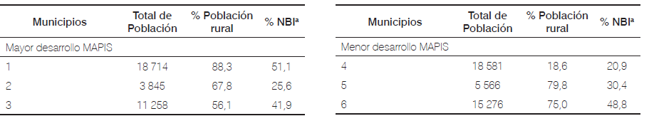 Se seleccionaron seis municipios por criterios de cobertura del mapis, condiciones de ruralidad, necesidades básicas insatisfechas y representatividad por provincias. Así, se estudiaron tres municipios con un grado de desarrollo mayor del mapis y otros tres menos desarrollados (Tabla 2). La recolección de la información se realizó en el año 2010.