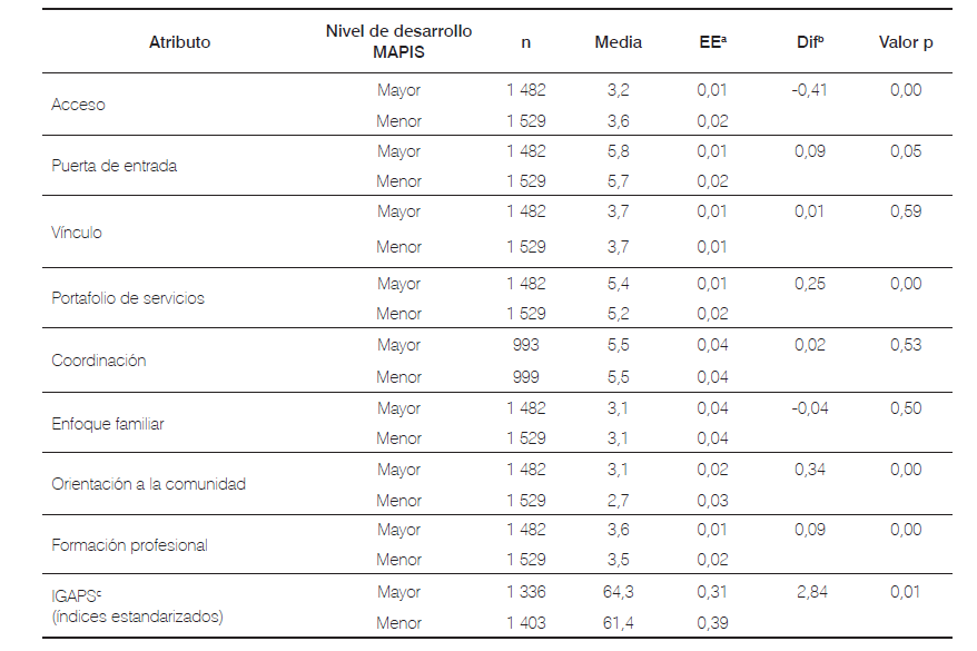 Los cuestionarios de evaluación del desempeño del mapis se aplicaron a 3 011 usuarios de los centros de salud de los seis municipios. Las calificaciones más bajas fueron para los atributos de enfoque familiar, orientación a la comunidad y acceso en todos los municipios. Al comparar el igaps entre los usuarios se observó que los participantes de los municipios con mayor desarrollo calificaron con mayores puntajes (Tabla 3) y se observó que el nivel de desarrollo del mapis estuvo asociado con un incremento de casi tres puntos en el igaps, ajustado por el efecto de las diferencias basales de los grupos por medio de la inclusión del propenstiy score. Un análisis ampliado de este componente puede consultarse en una publicación previa [15].
