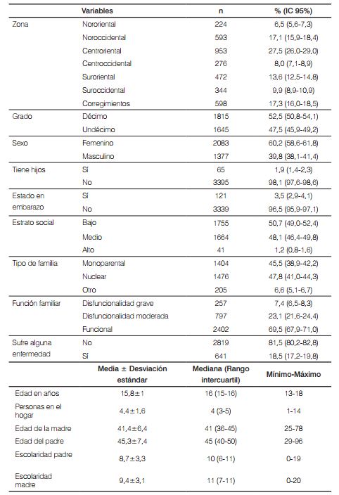 La edad promedio fue de 15,8±1 años, 52,5% (n = 1815) de grado décimo, 60,2% (n = 2083) son mujeres, 50,7% (n = 1755) de estrato socioeconómico bajo, 3,5% (n = 121) manifiesta que ha estado en embarazo y 18,5% (n = 641) sufre alguna enfermedad. En cuanto a la familia de los adolescentes, se encontró que la edad promedio de las madres fue de 41,4±6,4 años, de los padres de 45,3±7,4 años, la escolaridad promedio de ambos no superó los 10 años, 45,5% (n = 1404) de los adolescentes refiere que vive sólo con uno de los padres, 6,6% (n = 205) no vive con el padre ni la madre y 30,5% (n = 1054) percibe que su familia es disfuncional (Tabla 1).
