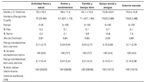 Previo a la descripción del perfil de calidad de vida en la población de estudio, se evaluó la confiabilidad, consistencia interna, validez discriminante, validez predictiva y algunas medidas de resumen de las dimensiones del KIDSCREEN–27. En este sentido se encontró que la Actividad física y salud es la dimensión con el puntaje más bajo (66,0±18,5) y el Entorno escolar presenta el puntaje más alto (73,9±16,8); además el instrumento presenta excelente fiabilidad con Alfa de Cronbach superior a 0,8 en todas las dimensiones, con un porcentaje de éxito en la consistencia interna y en la validez discriminante del 100% , así como muy buena validez predictiva, ya que los ítems del instrumento explican el 55% de la calidad de vida de los adolescentes (Tabla 2).