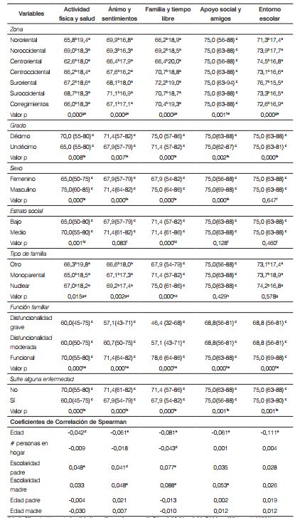 Las demás variables independientes que explican el perfil de calidad de vida fueron la edad, el grado de escolaridad, el estrato social, la edad del padre y la escolaridad de la madre. No obstante, la importancia de estas variables no es transversal a todo el perfil de calidad de vida, sino que sobresale en algunos dominios, por lo que se propone priorizar las intervenciones en los aspectos transversales a todos los dominios y posteriormente recabar en los factores importantes de cada dimensión en particular.