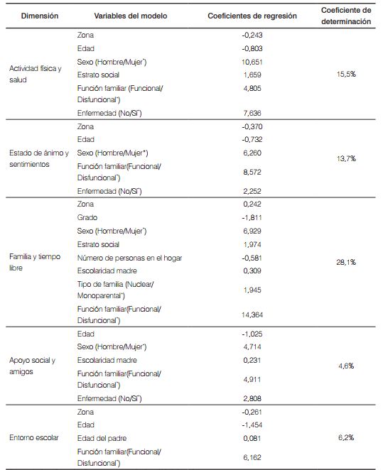 Al analizar el perfil de calidad de vida según aspectos sociodemográficos, de salud y de funcionalidad familiar, se presentaron diferencias significativas de todos los dominios frente a la edad, la zona de residencia, el grado de estudio, el sexo (con excepción del domino de escuela) la funcionalidad familiar y el estado de salud. En adición a lo anterior, la Actividad física y saludtambién presentó asociación con el estrato social, el tipo de familia y la escolaridad del padre. El dominio de estado de Ánimo y sentimientos, se relacionó además con el tipo de familia, la escolaridad del padre y la escolaridad de la madre. La dimensión de Familia y tiempo libre con estrato socioeconómico, tipo de familia, número de personas en el hogar, escolaridad del padre y escolaridad de la madre. Finalmente, la dimensión que evalúa Apoyo social y amigos también se relacionó con la escolaridad de la madre (Tabla 3). De las asociaciones bivariadas descritas las únicas que no presentaron modificación del efecto (confusión), fueron el sexo, la escolaridad de la madre, el número de personas en el hogar y la funcionalidad familiar.