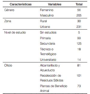 La caracterización demográfica de los participantes mostró que el 78,54% de los participantes fueron hombres y el 21,46% mujeres, la mayoría residían en la zona urbana (88,51%), mientras que el 11,49% en la zona rural (Tabla 1). Se observó que el 37,93% tenía estudios de educación básica primaria, el 47,89%, educación secundaria, el 6,90% formación técnica o tecnológica y el 5,36% fueron profesionales universitarios. La población según las actividades de riesgo se distribuyó de la siguiente manera: 73 (28%) trabajadores en plantas de beneficio animal, 107 (41%) en recolección de residuos sólidos y 81 (31%) en alcantarillado y acueducto.