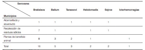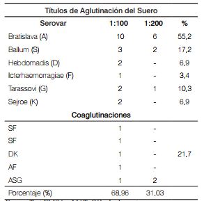 La identificación de los serovares circulantes se realizó mediante la prueba de Microaglutinación (MAT) en el Laboratorio Nacional de Diagnóstico Veterinario del Instituto Colombiano Agropecuario ICA. Se usó un panel de dieciséis serovariedades de Leptospira spp. así: serovares Icterohaemorrhagiae, Pomona, Grippotyphosa, Canicola, Bratislava, Hardjo prajtino, Hardjo bovis, Hebdomadis, Sejroe, Wolffii, Copenhageni, Ballum, Tarassovi, Autumnalis, Panama y Cynoptery . Se consideró seropositividad para Leptospira spp, cuando las muestras tuvieron títulos iguales o superiores a 1:100 según lo establecido por la OMS [17].