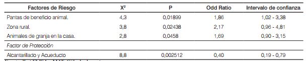 El análisis de asociación indicó que la actividad en plantas de beneficio animal fue el único factor de riesgo consistente (OR= 1,86; IC 1.02–3,38), con una probabilidad de casi dos veces de presentar anticuerpos IgM anti– Leptospira en este grupo de trabajadores, mientras que las variables localización en zona rural y la presencia de animales de granja en el domicilio, aunque presentaron odds ratios relativamente altos (2,17 y 1,69, respectivamente), el intervalo de confianza incluyó el valor 1 (indiferente), indicando que la fuerza de dicha asociación es aun débil (Tabla 4). La actividad laboral en empresas de alcantarillado y acueducto, aparentemente se encontró como un factor protector para la presencia de anticuerpos IgM contra Leptospira ; no obstante, este resultado podría deberse al bajo número de muestras analizadas.