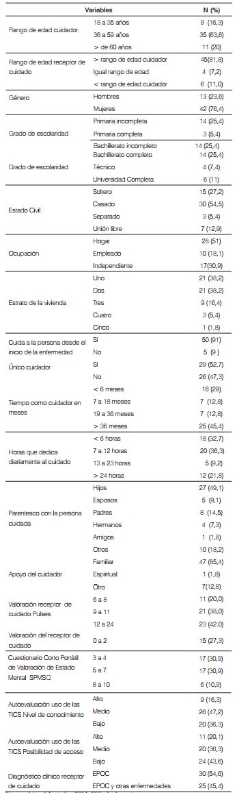 Encuesta de caracterización del cuidador de persona con enfermedad crónica del grupo de cuidado de la Universidad Nacional de Colombia GCPCC_UNC [7] que incluye 15 ítems respecto al perfil sociodemográfico, la percepción de carga y apoyos y el uso de tecnologías de la información y comunicación.