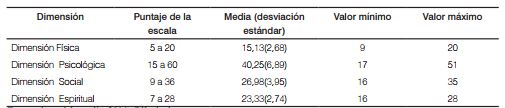 En cuanto a las dimensiones, se identifica para la física, psicológica y social una percepción media de la calidad de vida. En contraste para el componente espiritual el estudio reportó una alta de calidad de vida (Tabla 2).
