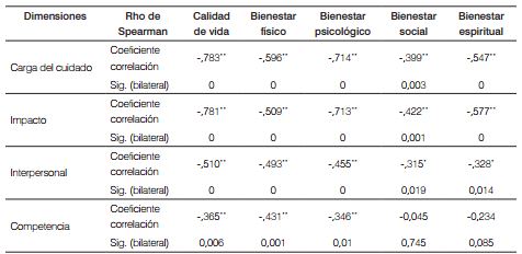 Moderada correlación (0,3 y 0,5) entre la carga total y el bienestar social; la dimensión de impacto de carga con el bienestar social, la dimensión interpersonal de carga con el bienestar físico, psicológico y social; y la dimensión competencia de carga con la calidad de vida total, la dimensión física y psicológica (Tabla 3) .