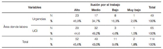 En cuanto a la dimensión ilusión por el trabajo como lo muestra la Tabla 1, se encontró que el 16,3% y el 2% de los profesionales de enfermería de los servicios de Urgencias y el 4,6% y el 1,5% de los/as enfermeros/as de UCI, presentaron puntuaciones bajas y muy bajas en esta dimensión, lo que indica desmotivación por su trabajo.