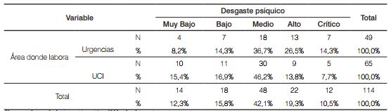 En la Tabla 2, nótese que el 26,5% y el 14,3% de los/as enfermeros/as del servicio de urgencias presentaron niveles alto y crítico respectivamente de desgaste psíquico, mientras que en la UCI los porcentajes más altos se presentaron en los niveles muy bajo, bajo y medio. Este resultado se asocia a que los/as enfermeros/as con niveles altos de desgaste psíquico, presentan agotamiento emocional y físico.