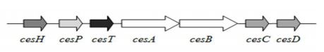 Nota: El locus comprende una hidrolasa (cesH), una transferasa (cesP), una tioesterasa (cesT), dos módulos NRPS (cesA y cesB) y un transportador ABC (cesC y cesD) [26].