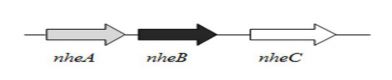 La enterotoxina no hemolítica (NHE), al igual que la enterotoxina HBL, está formada por tres subunidades; la subunidad NheA actúa como componente citolítico y las subunidades NheB y NheC favorecen la unión a las células epiteliales del intestino delgado [13]. La enterotoxina NHE es codificada por los genes nheA, nheB y nheC , los cuales conforman el operón nhe (figura 3), ubicado en el cromosoma de B. cereus [30]. Recientemente se encontró que la cepa B. weihenstephanensis KBAB4, además de portar el operón nhe en el cromosoma, contenía una segunda copia del locus nhe en un plásmido de 400 Kb [23].