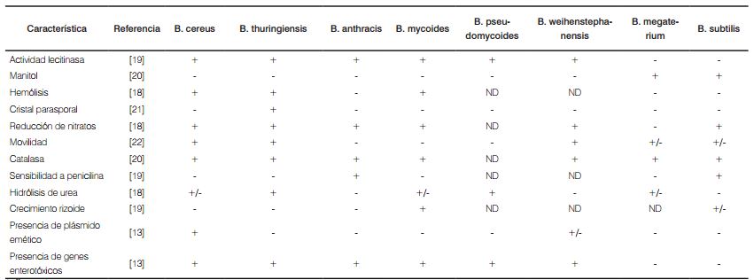 Bacillus cereus puede ser aislado e identificado en muestras alimenticias en el medio de cultivo MYP. La característica principal para la identificación de B. cereus en este medio es la formación de un precipitado blanco, alrededor de las colonias que crecen de color rosa, el cual corresponde a la hidrólisis de lecitina en el medio por B. cereus . El rojo de fenol se utiliza para detectar cambios de pH en el medio producto de la fermentación del manitol; las colonias que crecen de coloración amarilla, resultado del descenso de pH del medio por la fermentación del manitol, no corresponden a colonias de B. cereus , y la polimixina determina la selectividad del medio puesto que inhibe a las bacterias Gram negativas [18]. Este medio ha sido utilizado en diversos estudios para el aislamiento, enumeración y caracterización de B. cereus en diferentes matrices como arroz [53], alimentos refrigerados que contienen vegetales [54], entre otros. El inconveniente de utilizar este medio es que no diferencia a B. cereus de otros miembros del grupo 1A de Bacillus como B. thuringiensis, B. anthracis y B. mycoides , hecho que puede generar una identificación errónea de la cepa de B. cereus [55]; por esta razón, que se requiere utilizar otras pruebas fenotípicas (Tabla 1) para corroborar que se trata de una cepa B. cereus [56]. Además de estas pruebas de diferenciación, también se han utilizado medios cromogénicos como los agares CBC (por sus siglas en inglés Chromogenic Bacillus Cereus agar) y BCM (B. cereus group plating medium); estos son útiles para identificar cepas de B. cereus que no se pueden diferenciar en agar MYP o PEMBA por no tener actividad lecitinasa [57].