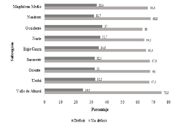 Al considerar la malnutrición para el indicador talla para la edad 0-17 años, se encontró que la malnutrición por déficit fue mayor en la subregión de Occidente, 37,0%, en contraste con la subregión Valle de Aburrá, donde el 75,5% no presentó deficiencias nutricionales (Figura 1).