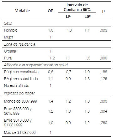 Se construyó un modelo de regresión logística binaria para la malnutrición según talla para la edad (0-17 años), donde se encontró que el sexo, la zona de residencia, la afiliación a la seguridad social en salud y los ingresos del hogar son las que mejor explican su variabilidad. El riesgo de malnutrición por déficit según talla para la edad fue similar por sexo; de igual manera, el riesgo de malnutrición fue mayor en los niños, niñas y adolescentes que residían en la zona rural con respecto a los de la zona urbana; con respecto a la afiliación a la seguridad social en salud, se observó que presentaron un mayor riesgo de malnutrición aquellos niños, niñas o adolescentes que pertenecían al régimen subsidiado, comparado con los niños que no contaban con ningún tipo de afiliación en el momento del estudio (OR= 1,1 LI= 0,9 LS= 1,3); cabe destacar que los niños, niñas y adolescentes que contaban con ingresos del hogar menores a $307.000 presentaron mayor riesgo de malnutrición según el indicador talla para la edad respecto a los niños, niñas y adolescentes que contaban con ingresos en sus hogares mayores a $1.032.000 (Tabla 3).