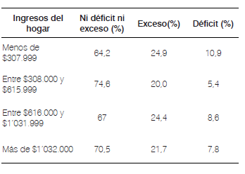 Con respecto a la variable de zona de residencia fue mayor el exceso de malnutrición en la zona urbana, 23,1%, y mayor el déficit de la misma en la zona rural, 8,1%. Teniendo en cuenta la afiliación a la seguridad social, se observó mayor prevalencia de malnutrición por exceso en aquellos adscritos al régimen subsidiado, 24,2%. Es llamativo que en la mayoría de los hogares que tenían ingresos inferiores a $307.900, (24%), fue mayor la malnutrición por exceso, cuando se consideró el indicador peso para la talla situación ídem a la que ocurrió con el déficit de malnutrición (10,9%) (Tabla 4).